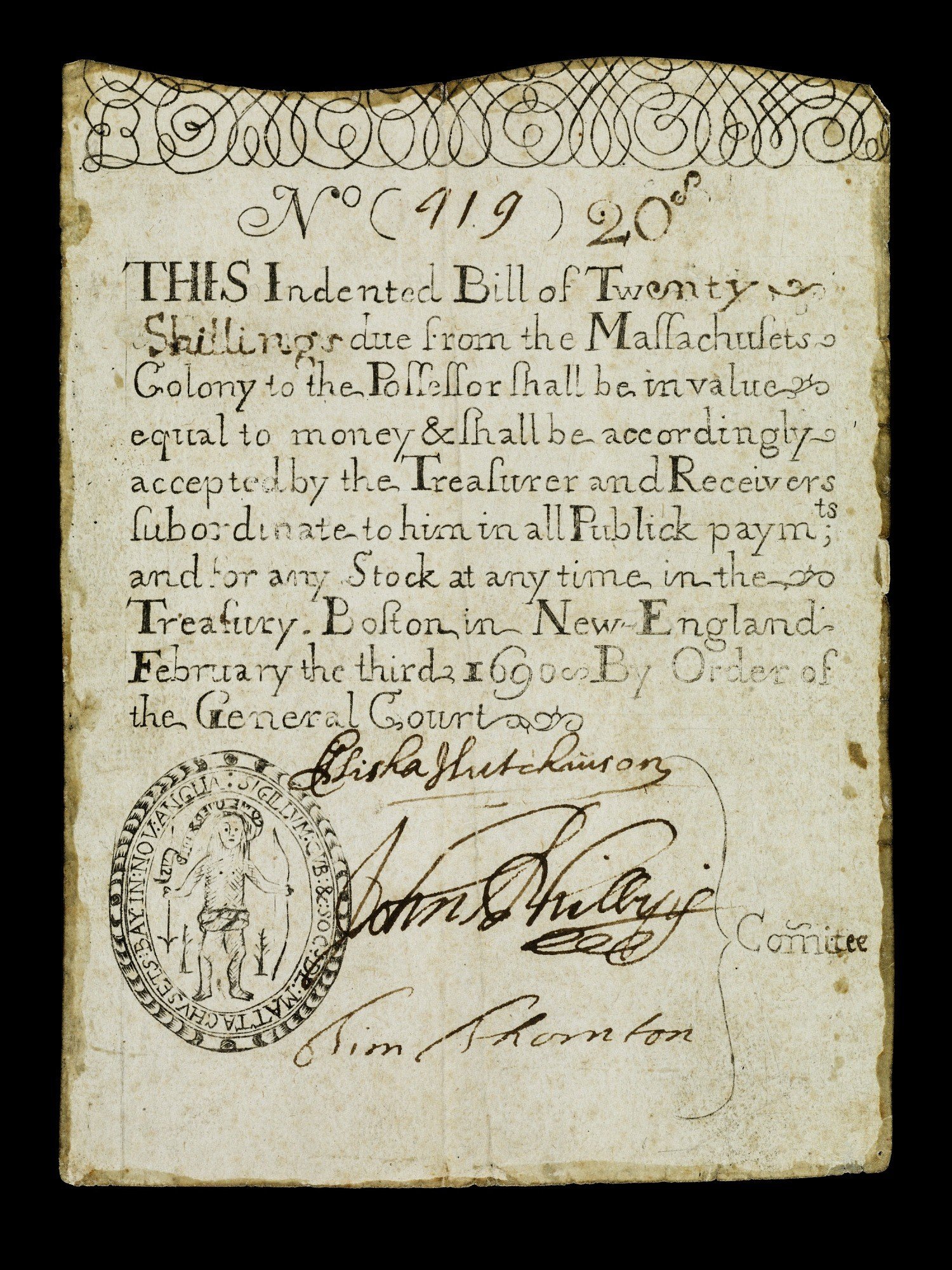En 1689, esta pequeña comunidad se enfrentó con la necesidad de pagar a los soldados regresados de una expedición en territorios franceses. A pesar de disponer de muchos activos no líquidos, les faltaban monedas de metal, el único medio de cambio de aquella época.