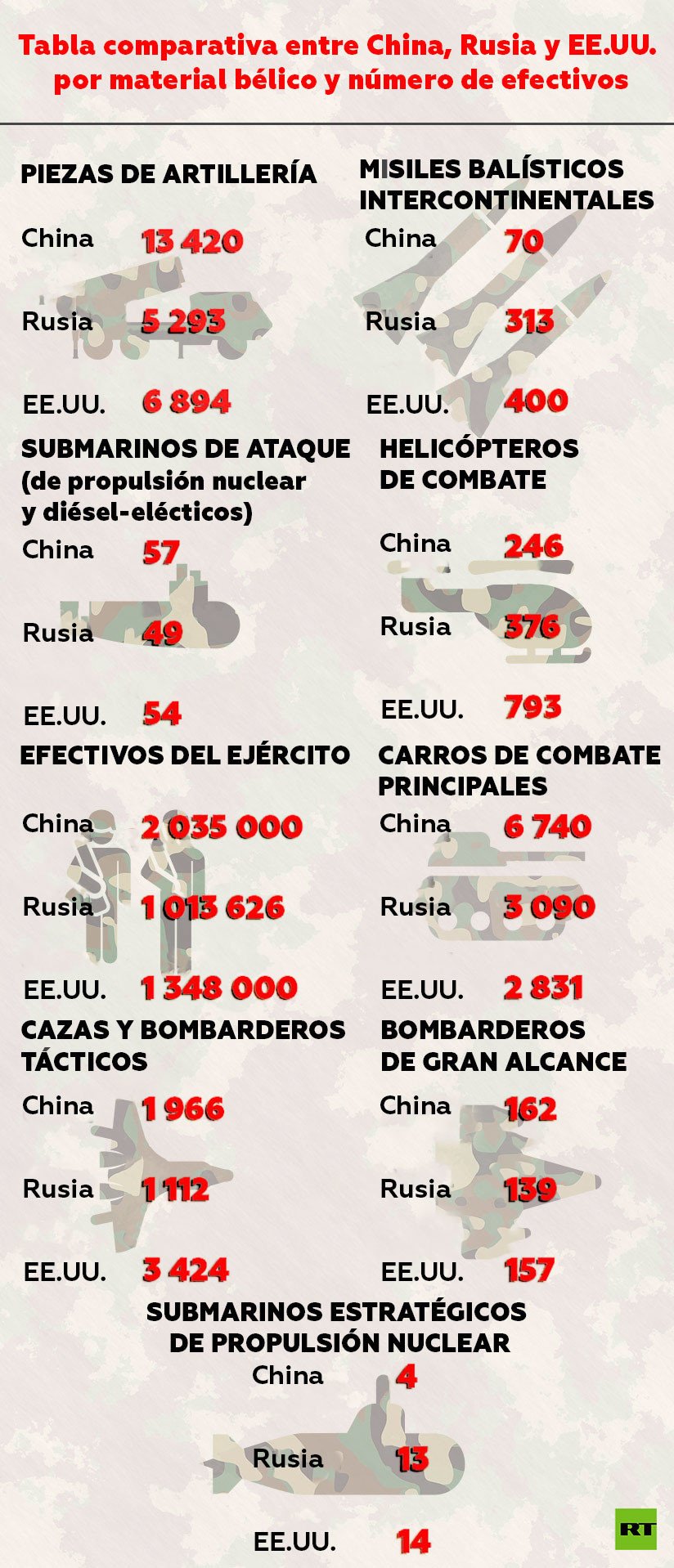 Si compara su ejército con el de Rusia y Estados Unidos en términos estadísticos, Pekín puede sentirse orgulloso, al situarse por delante de sus principales competidores en cinco de las nueve categorías clave.