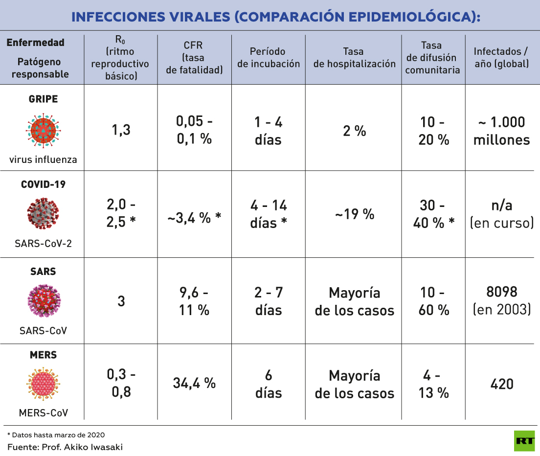 Por último, el nivel propagación en la comunidad del coronavirus también es más elevado, alcanzando un impacto del 40 %, cuando el virus influenza solo afecta a entre 10 y 20 % de la población.