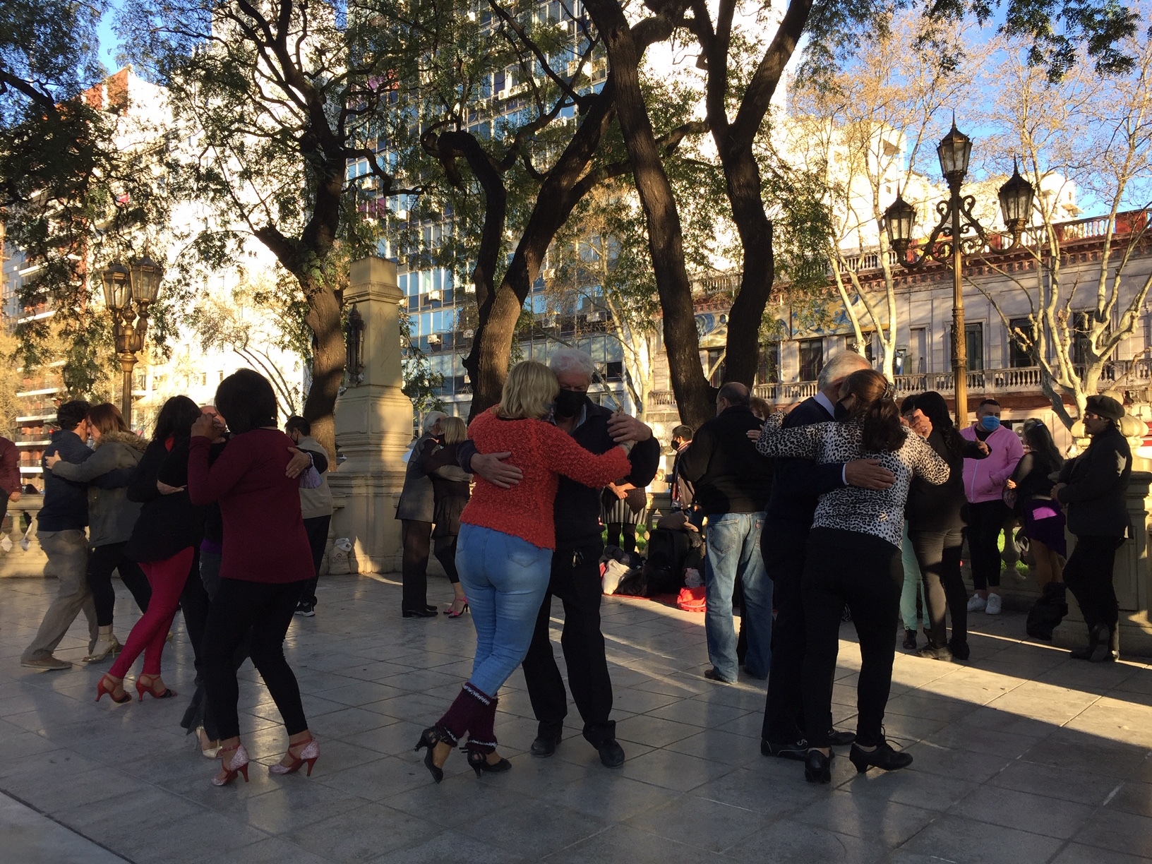 "Ya me di las dos dosis", explica un hombre delgado y canoso un lunes por la noche en una milonga callejera del barrio de Almagro. Justifica así su negativa a usar cubrebocas porque le incomoda para bailar. Cuando le explico que pone en riesgo a sus parejas y a quienes están alrededor, se limita a sonreír y encoger los hombros.