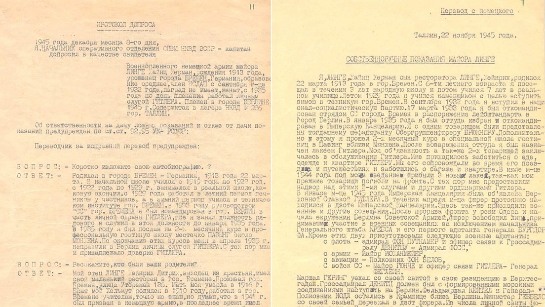 Archivos hasta ahora poco conocidos, que arrojan luz sobre los últimos minutos de Adolf Hitler, han sido recientemente desclasificados por el Servicio Federal de Seguridad de Rusia (FSB). Entre esos documentos se encuentran testimonios de Heinz Linge, un oficial de las SS que fungió como ayuda de cámara del dictador alemán.